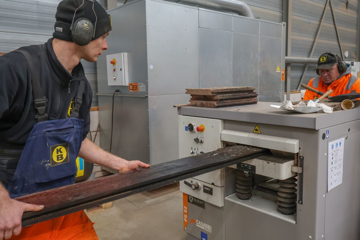 “Ik motiveer en coach graag mensen die extra aandacht nodig hebben om hun plek te vinden op de arbeidsmarkt. Ze hoeven geen ervaring met houtverwerking te hebben, dat leer ik ze wel. Het enige dat ik van ze verlang is dat ze eerlijk zijn en zich houden aan mijn motto afspraak = afspraak," vertelt Korthoef gepassioneerd: “De jongens doorlopen hier elke stap in het proces. Het begint met het schoonspuiten en sorteren van binnengebrachte planken. Vervolgens korten ze de planken in en frezen ze de vingerlas. Na het verlijmen op de persbank schuren ze de lijmresten eraf.